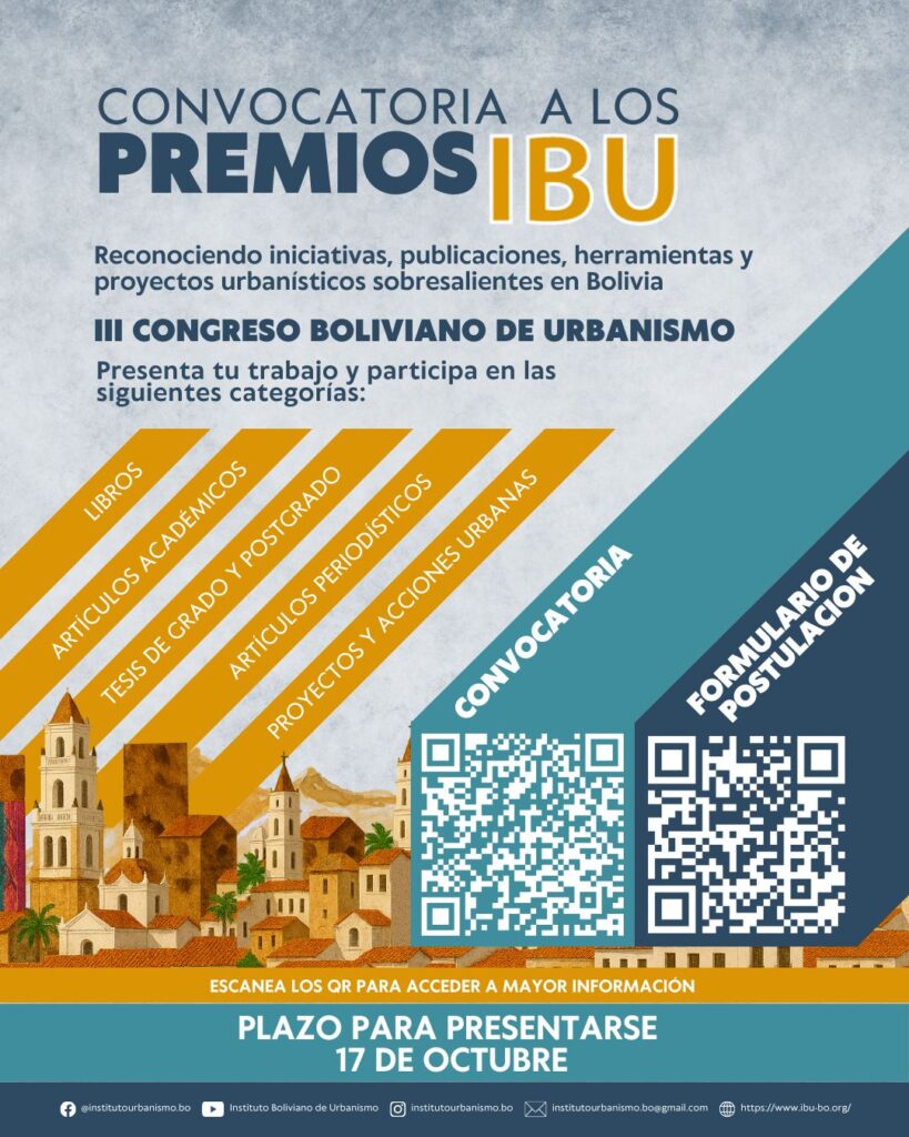 PREMIOS IBUIII Congreso Boliviano de Urbanismo - 2025 Las ciudades bolivianas y del sur global en el giro positivo: hacia nuevas narrativas sobre lo urbano LEER CONVOCATORIA "PREMIOS IBU" POSTULACIÓN "PREMIOS IBU"